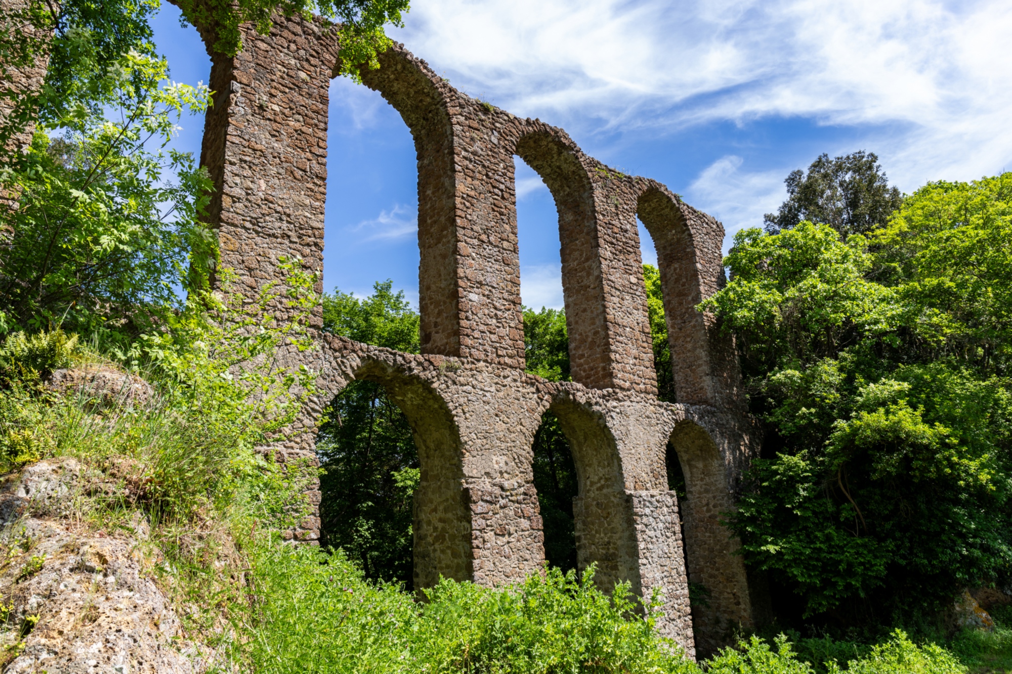 Il percorso lambisce quindi le Terme di Stigliano, rinomate fin dall’epoca romana per le loro acque sulfuree. Dopo l’area termale, il sentiero prosegue in leggera salita e, tra tratti di pascolo e boschi di querce, si incontra la Necropoli del Ferrone, un complesso di tombe rupestri di epoca etrusca, ricavate nella roccia tufacea e immerse in un paesaggio ancora incontaminato.